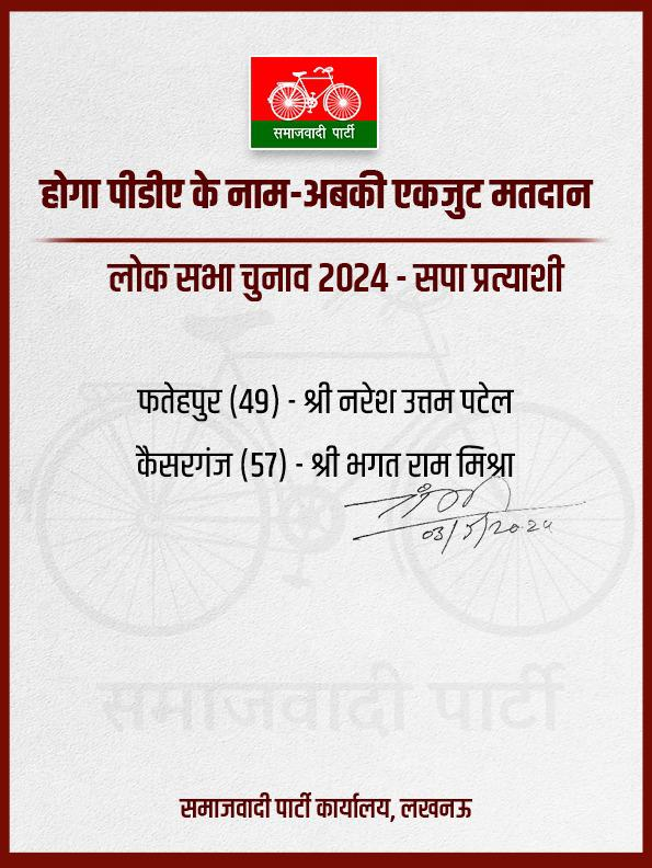 सपा ने कैसरगंज से भगत राम मिश्रा और फतेहपुर से नरेश उत्तम पटेल को अपना उम्मीदवार बनाया है। पार्टी ने आज नामांकन के आखिरी दिन अपने प्रत्याशियों के नामों की घोषणा की हैं।